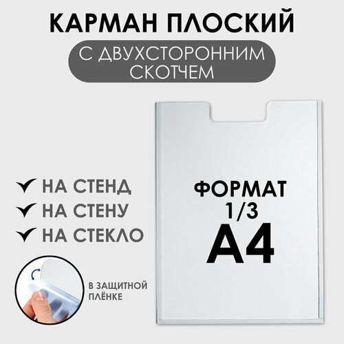Карман для информации плоский 1/3 А4, вертикальный, акрил, со скотчем, прозрачный