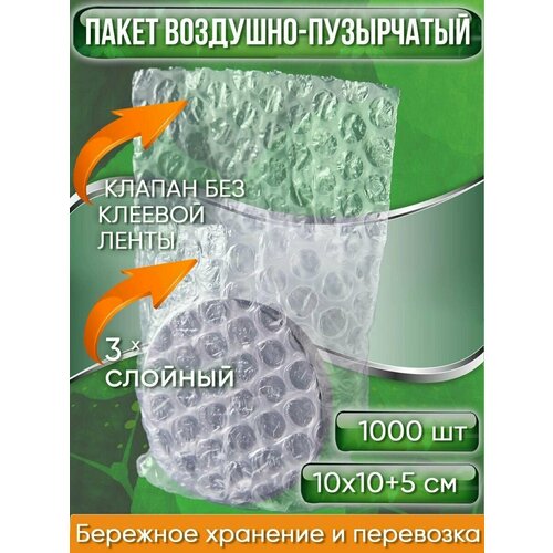 Пакет воздушно-пузырчатый (ВПП, пузырьковый, пупырчатый), 10х10+5 см, клапан без клеевой ленты, трехслойный, 1000 шт.