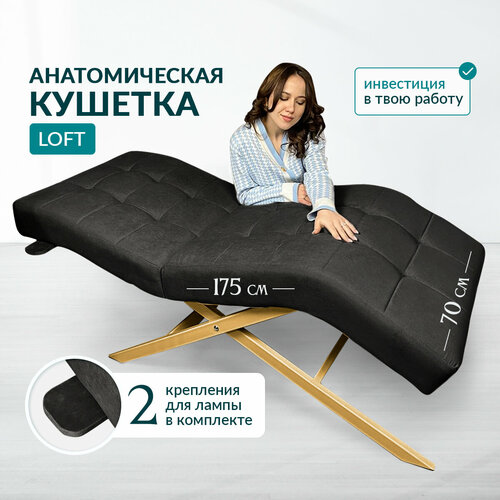 Анатомическая кушетка в стиле Лофт, в салон красоты, золотая ножка, в студию, для наращивания ресниц, для преманентного макияжа, Велюр Цвет Черный