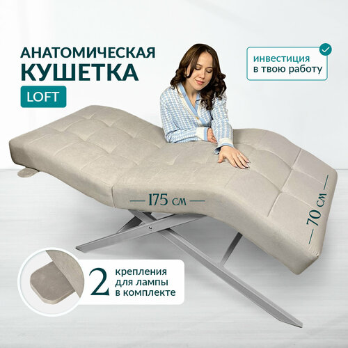 Анатомическая кушетка в стиле Лофт, в салон красоты, серебристая ножка, в студию, для наращивания ресниц, для преманентного макияжа, Велюр Цвет Бежевый