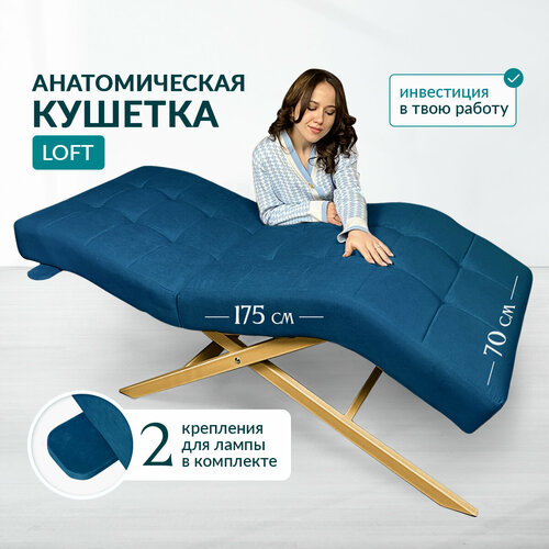 Анатомическая кушетка в стиле Лофт, в салон красоты, золотая ножка, в студию, для наращивания ресниц, для преманентного макияжа, Велюр Цвет Синий