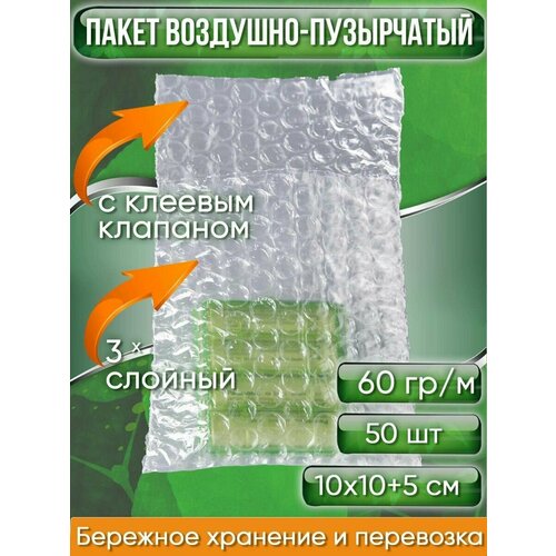 Пакет воздушно-пузырчатый (ВПП, пузырьковый, пупырчатый), 10х10+5 см, с клеевым клапаном, трехслойный, 50 шт.