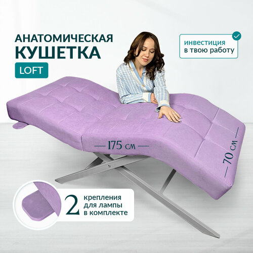 Анатомическая кушетка в стиле Лофт, в салон красоты, серебристая ножка, в студию, для наращивания ресниц, для преманентного макияжа, Велюр Цвет Сиреневый