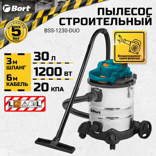 BORT Строительный пылесос Пылесосы строительные Bort для сухой И влажной уборки BSS-1230-DUO 93417494 { 1200 Вт, вместимость 30 л, 37 л/сек, 6,7 кг, набор аксессуаров 9 шт }