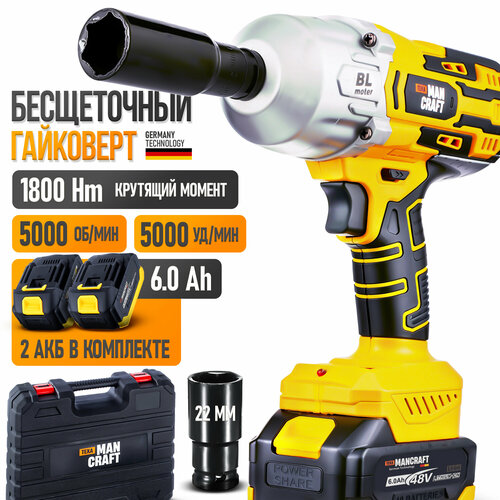 Гайковёрт аккумуляторный ударный MANCRAFT бесщёточный 1800 Hm, 6000 об/мин, 2 акк по 48В