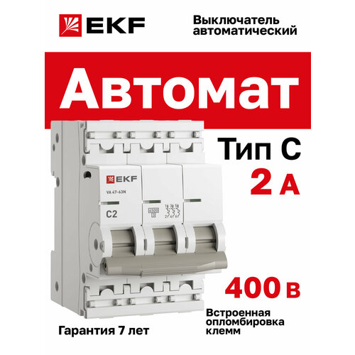 Автомат 2А, тип C, трехполюсный 3P, 4,5kA, cо встроенной опломбировкой клемм EKF PROXIMA ВА 47-63N (Автоматический выключатель C2)