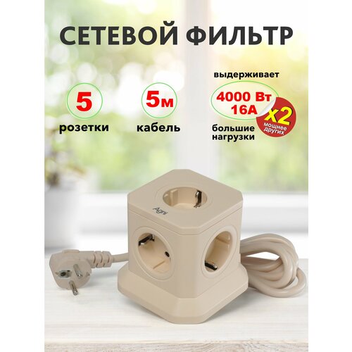 Сетевой фильтр, AGNI, 5 розеток, с предохранителем и заземлением, кабель 5м, слоновая кость
