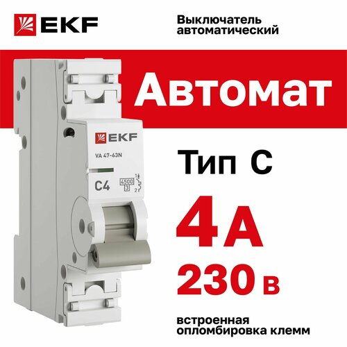 Автомат 4А, тип C, однополюсный 1P, 4,5kA, cо встроенной опломбировкой клемм EKF PROXIMA ВА 47-63N (Автоматический выключатель C4)