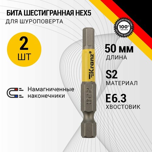 Бита износостойкая шестигранная для шуруповерта KRANZ с магнитным наконечником HEX5х50 мм, 2 штуки