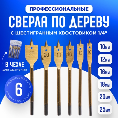 Набор перьевых свёрл по дереву 6шт, диаметры 25-10 мм, шестигранный хвостовик