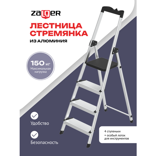 Стремянка алюминиевая 4 ступени, с лотком для инструментов, Zalger, арт. 211-4
