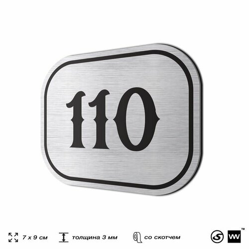 Номерок на дверь квартиры 110, для кабинета, офиса, шильдик 9 х 7 см, серебристый, Айдентика Технолоджи