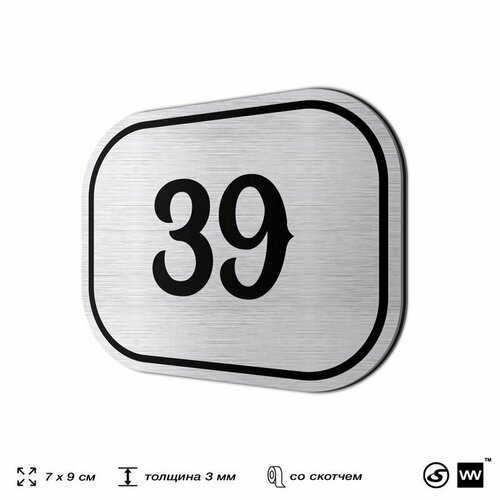 Номерок на дверь квартиры 39, для кабинета, офиса, шильдик 9 х 7 см, серебристый, Айдентика Технолоджи