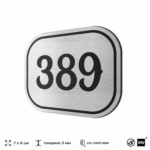 Номерок на дверь квартиры 389, для кабинета, офиса, шильдик 9 х 7 см, брашированная сталь, Айдентика Технолоджи