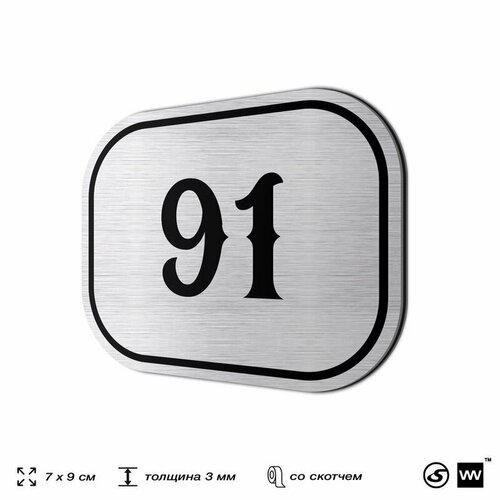 Номерок на дверь квартиры 91, для кабинета, офиса, шильдик 9 х 7 см, серебристый, Айдентика Технолоджи