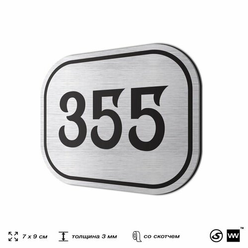 Номерок на дверь квартиры 355, для кабинета, офиса, шильдик 9 х 7 см, брашированная сталь, Айдентика Технолоджи