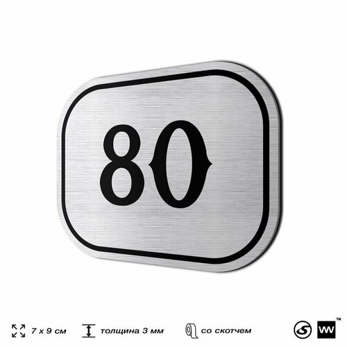 Номерок на дверь квартиры 80, для кабинета, офиса, шильдик 9 х 7 см, серебристый, Айдентика Технолоджи