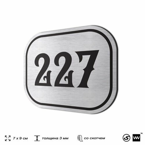 Номерок на дверь квартиры 227, для кабинета, офиса, шильдик 9 х 7 см, серебристый, Айдентика Технолоджи