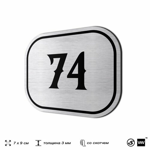 Номерок на дверь квартиры 74, для кабинета, офиса, шильдик 9 х 7 см, серебристый, Айдентика Технолоджи