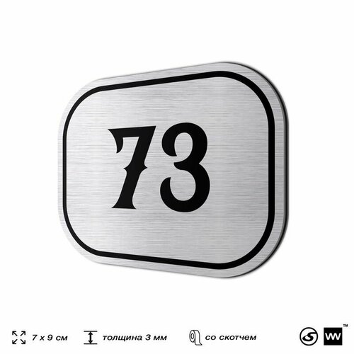 Номерок на дверь квартиры 73, для кабинета, офиса, шильдик 9 х 7 см, серебристый, Айдентика Технолоджи