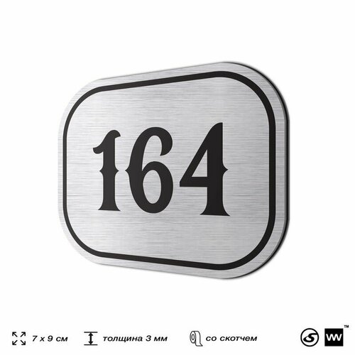 Номерок на дверь квартиры 164, для кабинета, офиса, шильдик 9 х 7 см, серебристый, Айдентика Технолоджи