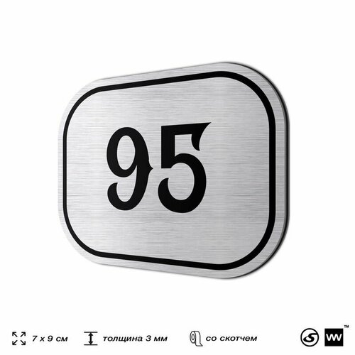 Номерок на дверь квартиры 95, для кабинета, офиса, шильдик 9 х 7 см, серебристый, Айдентика Технолоджи