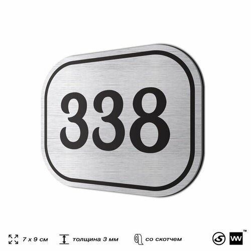 Номерок на дверь квартиры 338, для кабинета, офиса, шильдик 9 х 7 см, брашированная сталь, Айдентика Технолоджи