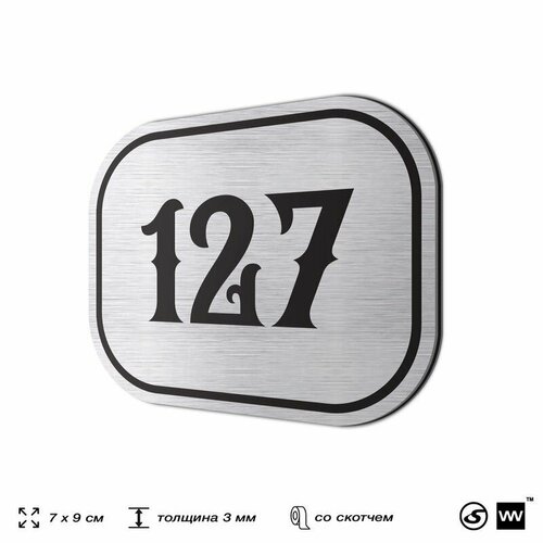 Номерок на дверь квартиры 127, для кабинета, офиса, шильдик 9 х 7 см, серебристый, Айдентика Технолоджи