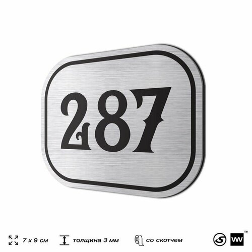 Номерок на дверь квартиры 287, для кабинета, офиса, шильдик 9 х 7 см, серебристый, Айдентика Технолоджи