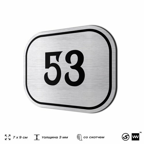 Номерок на дверь квартиры 53, для кабинета, офиса, шильдик 9 х 7 см, серебристый, Айдентика Технолоджи