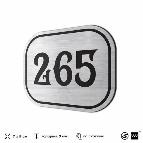 Номерок на дверь квартиры 265, для кабинета, офиса, шильдик 9 х 7 см, серебристый, Айдентика Технолоджи