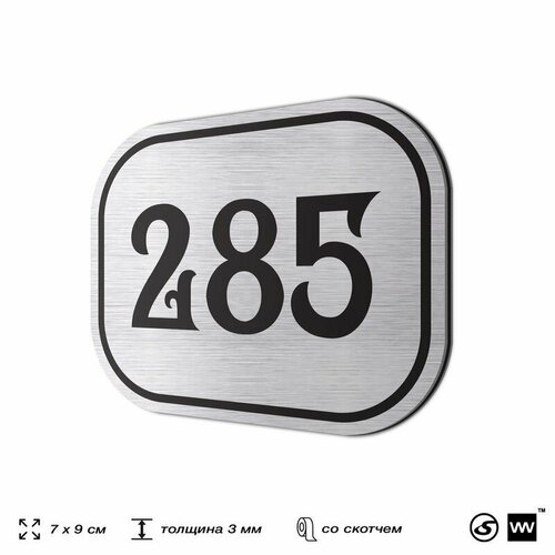 Номерок на дверь квартиры 285, для кабинета, офиса, шильдик 9 х 7 см, серебристый, Айдентика Технолоджи