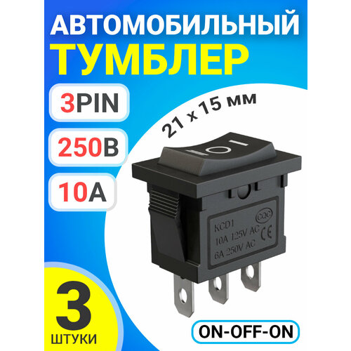 Тумблер выключатель автомобильный GSMIN KCD1 ON-OFF-ON 6А 250В / 10А 125В AC 3-Pin, 21х15мм, 3 штуки (Черный)