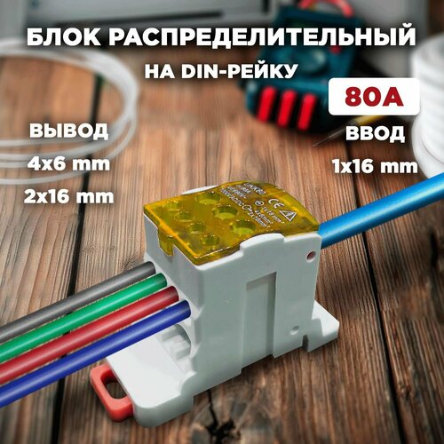 Шина РБД 80А нулевая фазная в корпусе на дин рейку 1х16мм желтая кросмодуль