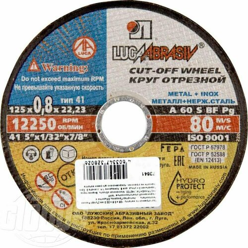 Круг отрезной по металлу LugaAbrasiv посадочный размер 22,23 мм, 125х0,8 мм