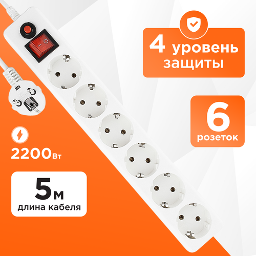 Сетевой фильтр Гарнизон ЕНLB-5, 5 розеток, с/з, 10А / 2200 Вт 5 1.4 м 2.25 кв. мм 350 мм 55 мм 50 мм