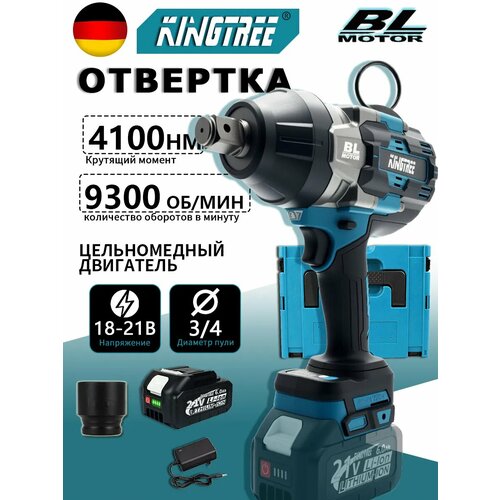 Гайковерт KINGTREE, 4100 Нм, 21В, 6Ач, 1 АКБ, быстрая зарядка, защита от перегрузок