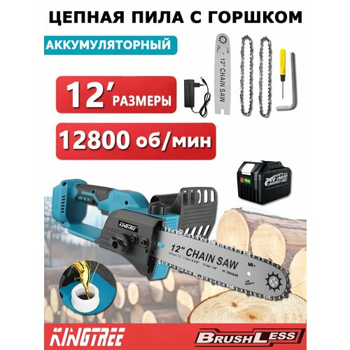 Цепная пила KINGTREE, 12", Li-Ion, бесщеточный мотор, скорость 12800 об/мин1 аккумулятора 9 Ач