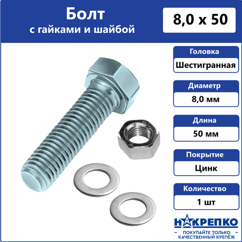 Болт оцинкованный М8 х 50 мм с шайбой и гайками 1 шт