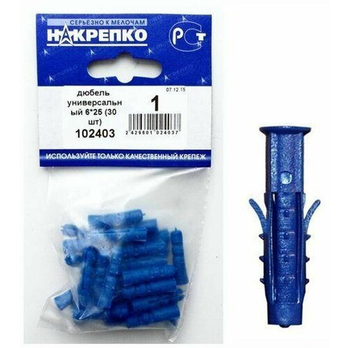 Дюбель универсальный, Накрепко, 25 х 6 мм, из синего пластика, 30 шт в наборе