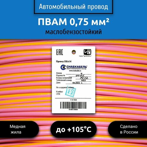 Провод автомобильный пвам (ПГВА) 0,75 (1х0,75) розово/желтый 100 м
