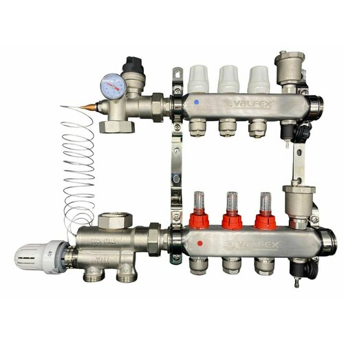 Комплект для монтажа водяного теплого пола VALFEX состоит из:● Коллекторной группы из нержавеющей стали с расходомерами● Насосно-см...