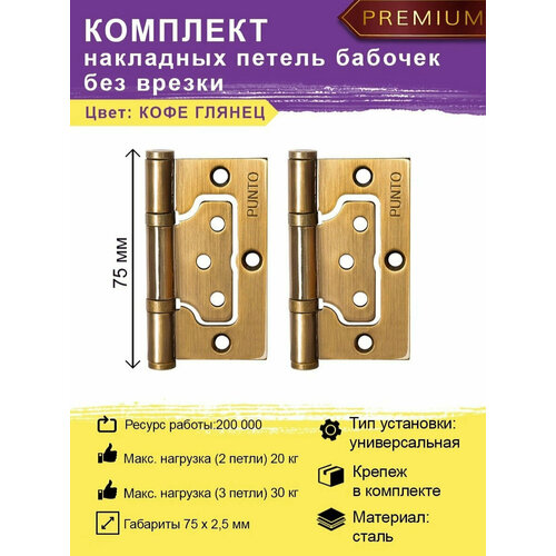 Дверные петли накладные PUNTO (Пунто) бабочки (без врезки) цвет кофе глянец для межкомнатных дверей комплект 2 шт (универсальные навесы 75 мм)