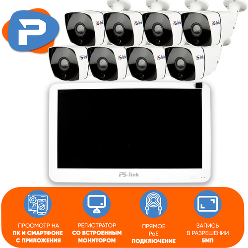 Комплект видеонаблюдения PS-link KIT-C508LCD IP-PoE/ монитор 10"/ 8 уличных камер/ 5 Мп