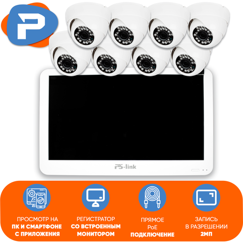 Комплект видеонаблюдения PS-link KIT-A208LCD IP-PoE/ монитор 10"/ 8 внутренних камер/ 2 Мп
