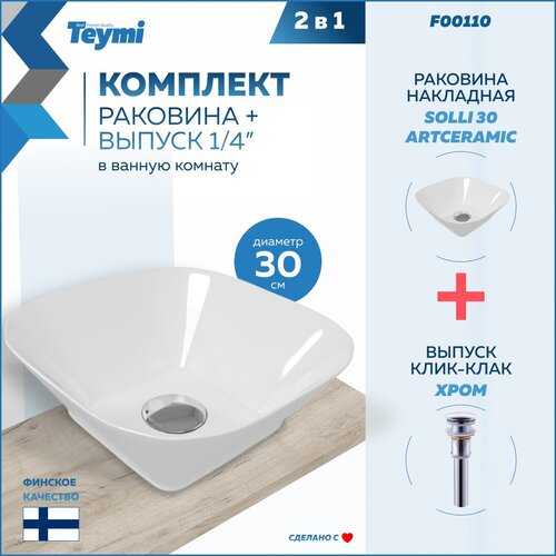 Комплект Teymi 2 в 1: Раковина Solli 30 artceramic накладная T50206 + выпуск для раковины 1/4", клик-клак, T90902 F00134