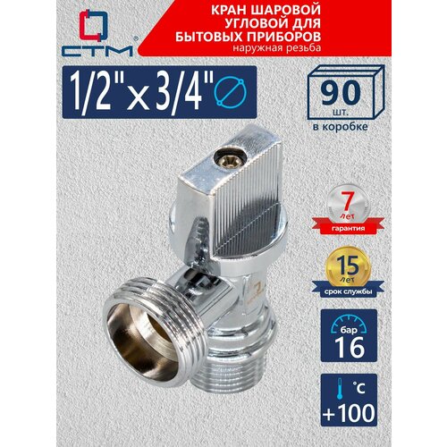 Кран шаровый для стиральной и посудомоечной машины угловой СTM 1/2"х3/4" штуцер-штуцер с отражателем бабочка, хром 90 шт