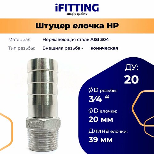 Штуцер с наружной резьбой 3/4 дюйма нержавеющий (Елочка 20 мм) НР DN20 3/4"-20 мм AISI 304