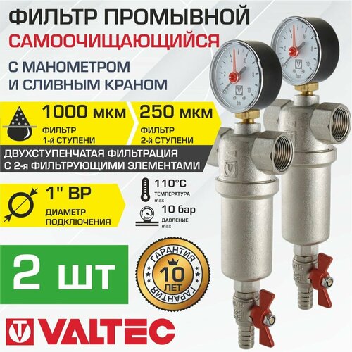 Фильтры самоочищающиеся промывные 1" ВР VALTEC (2 шт) с манометром и сливным краном / Каскадный грязевик ДУ25 для очистки воды с сетками 1000+250 мкм