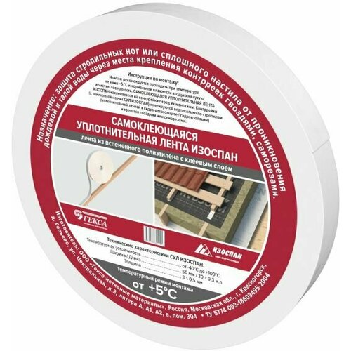 полиэтиленСамоклеящаяся уплотнительная монтажная лента Изоспан СУЛ 50мм, 30м. Лента из вспененного полиэтилена с клеевым слоем. Самоклеящаяся уплотнительная лента-предназначена для защиты стропильных ног или сплошного настила от проникновения дождевой и талой воды через места крепления контррейки гвоздями, саморезами. Наклеивается лента поверх гидроизоляционной пленки вдоль стропильных ног и других конструктивных элементов перед монтажом контррейки. Особенно рекомендуется для крыш с малым углом (менее 22 град.). Монтаж рекомендуется проводить при температуре не ниже +5° С и при нормальной влажности воздуха на сухую и чистую поверхность. Технические характеристики: Толщина: 3±0,5 мм Поверхностная плотность: 0,1+0,05 кг/м² Кажущаяся плотность: 33+5 кг/м² Предел прочности: при растяжении в прод./попер. направлении, не менее 0,33 / 0,21 МПа Относительное удлинение при разрыве: в прод./попер. направлении, не менее 130 / 100% Предел прочности: при равномерном отрыве, не менее 5 кг/см Температурная устойчивость: о